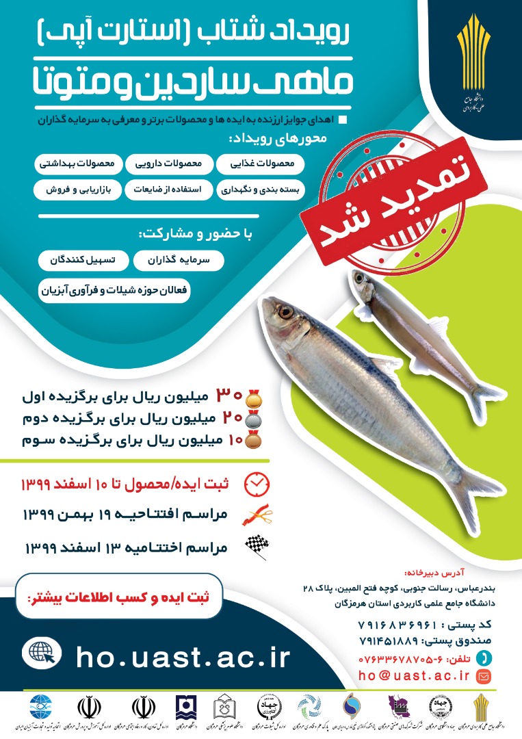 مهلت ثبت ایده/محصول در رویداد شتاب(استارت آپی) ماهی ساردین و متوتا تا ۱۰ اسفند ۱۳۹۹ تمدید شد