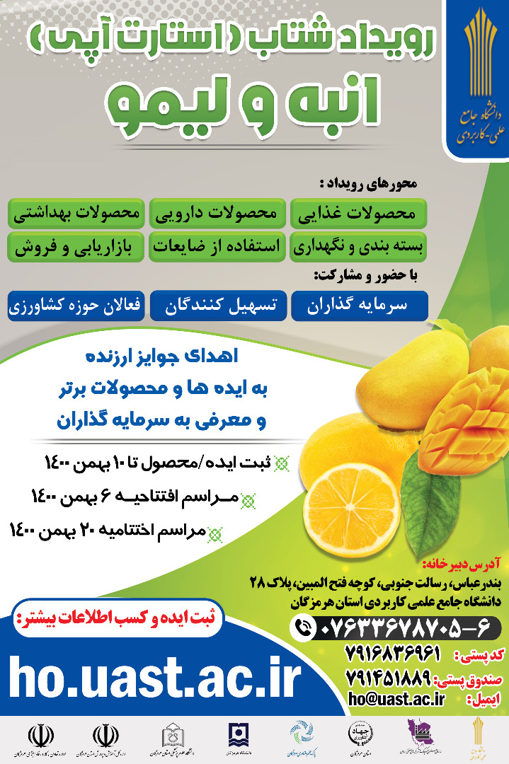 دانشگاه جامع علمی کاربردی استان هرمزگان در نظر دارد، رویداد شتاب(استارت آپی) انبه و لیمو را با مشارکت سازمان ها و ارگانهای مرتبط با همراهی بخش خصوصی و با حضور سرمایه گذاران، تسهیل کنندگان و فعالان حوزه کشاورزی در استان هرمزگان با محورهای محصولات غذایی، محصولات دارویی، محصولات بهداشتی، بسته بندی و نگهداری، استفاده از ضایعات، بازاریابی و فروش و سایر ایده های مرتبط با انبه و لیمو برگزار نماید.