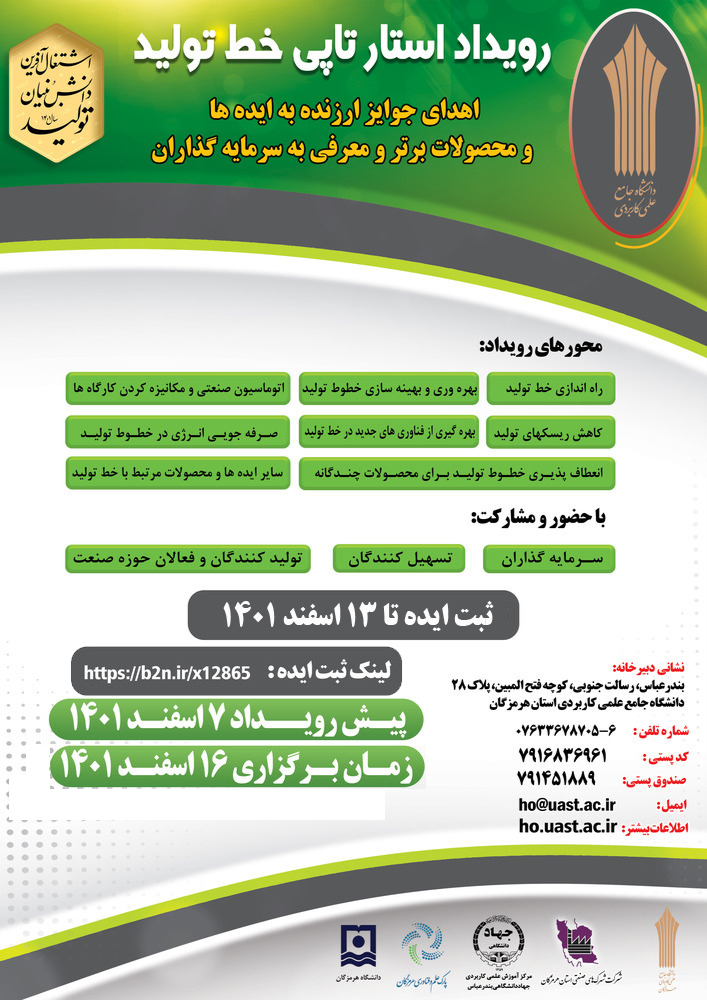 دانشگاه جامع علمی کاربردی استان هرمزگان در نظر دارد، رویداد استارت آپی خط تولید را با مشارکت سازمان ها و ارگانهای مرتبط با همراهی بخش خصوصی و با حضور سرمایه گذاران، تسهیل کنندگان و فعالان حوزه تولید در استان هرمزگان با محورهای راه اندازی خط تولید، بهره وری و بهینه سازی خطوط تولید، اتوماسیون صنعتی و مکانیزه کردن کارگاه ها، کاهش ریسک های تولید، بهره گیری از فناوری های جدید در خط تولید، صرفه جویی انرژی در خطوط تولید، انعطاف پذیری خطوط تولید برای محصولات چندگانه و سایر ایده ها و محصولات مرتبط با خط تولید برگزار نماید.