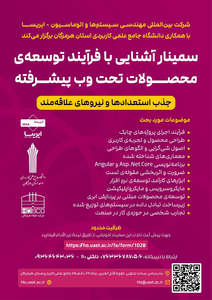 دانشگاه جامع علمی کاربردی استان هرمزگان در نظر دارد، سمینار آشنایی با فرآیند توسعه ی محصولات تحت وب پیشرفته را با مشارکت شرکت بین المللی مهندسی سیستم ها و اتوماسیون(ایریسا) برگزار کند.